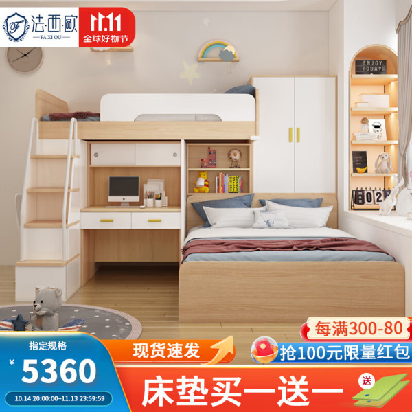法西欧(FAXIOU)儿童床高低床交错式上下床双层床多功能组合床小户型带书桌衣柜 整套书桌衣柜高箱床【上铺1米宽 1500x1900