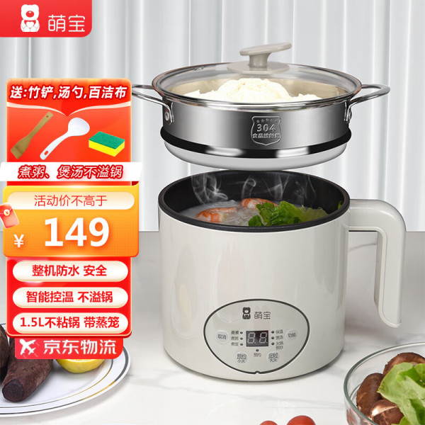 萌宝新款防水电煮锅多功能小电锅宿舍电热火锅家用不粘锅煮粥不溢11CM深锅设计1.8升智能 1.8L 白色不锈钢锅无蒸笼【会粘锅】
