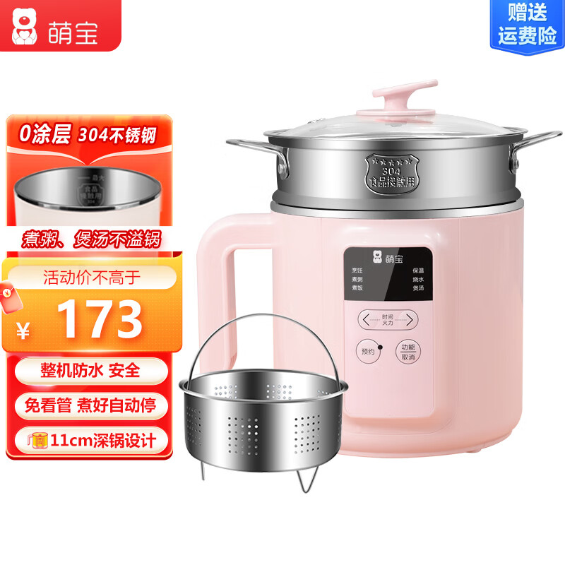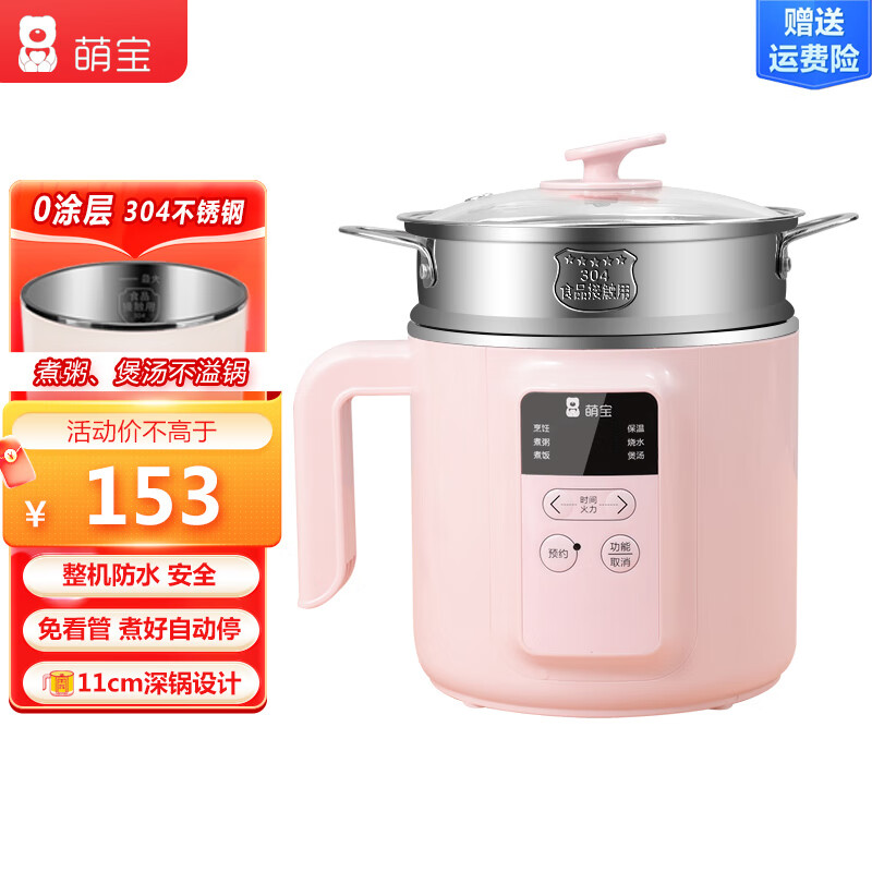 萌宝新款防水电煮锅多功能小电锅宿舍电热火锅家用不粘锅煮粥不溢11CM深锅设计1.8升智能 1.8L 粉色不锈钢锅带蒸笼【会粘锅】