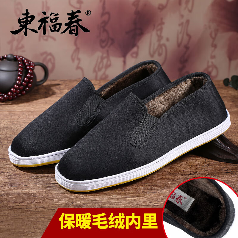 东福春老北京布鞋男传统手工老人千层底黑色老布鞋防滑青年懒人一脚蹬 DN31101加绒千层底 黄胶贴片 39