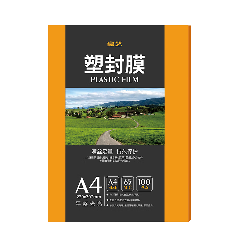 豪艺(HOOYE)A4 65mic塑封膜6.5丝高清透明塑封机过塑膜文件照片护卡膜220*307mm 100张/包