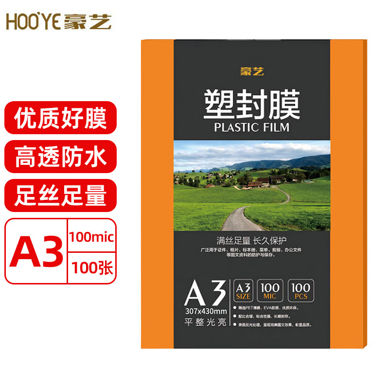 豪艺(HOOYE)A3 100mic 文件照片高透塑封膜/护卡膜/过塑膜 耐用加厚 100张/包