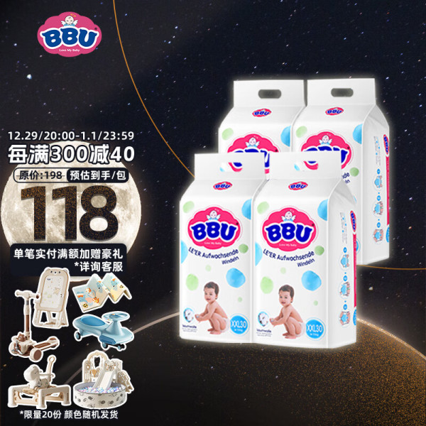 BBU 乐儿纺婴儿超薄 干爽 透气拉拉裤/学步裤/爬爬裤 4包增量装 XXL码30片*4包 (15Kg以上)