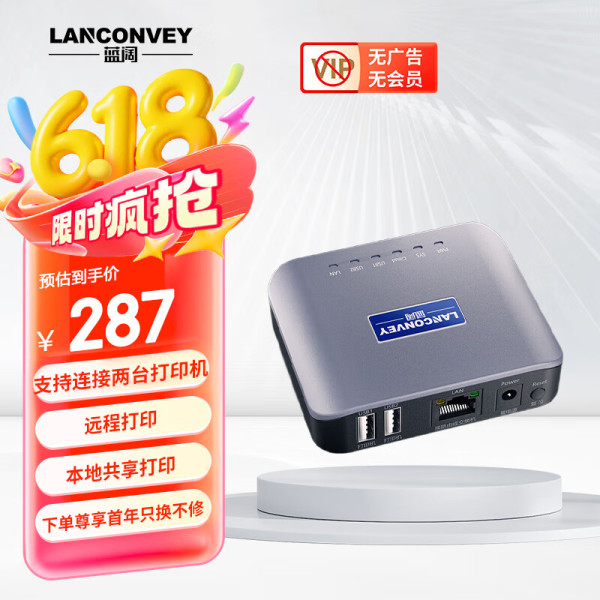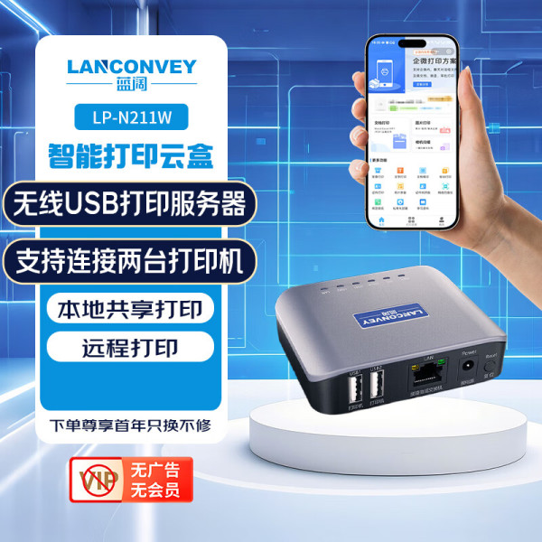 蓝阔 LANCONVEY 打印服务器支持电脑共享手机远程云打印小白盒子usb打印机