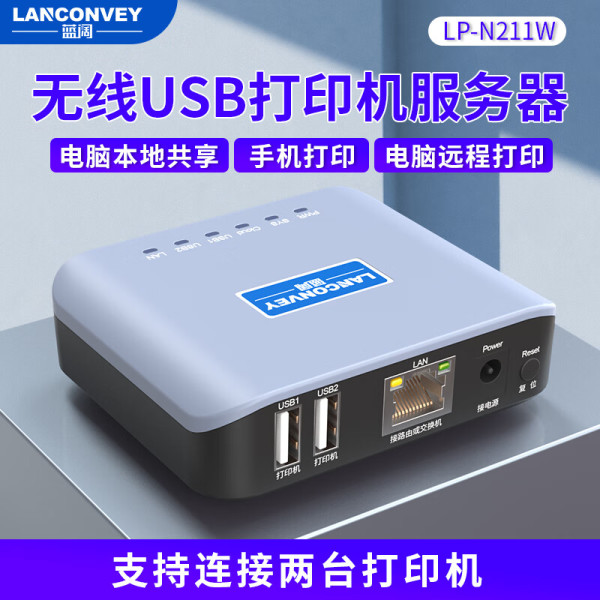 蓝阔 LANCONVEY LP-N211W无线双USB口打印服务器支持两台打印机共享wifi有线两用 扫描仪网络共享器云盒子手机