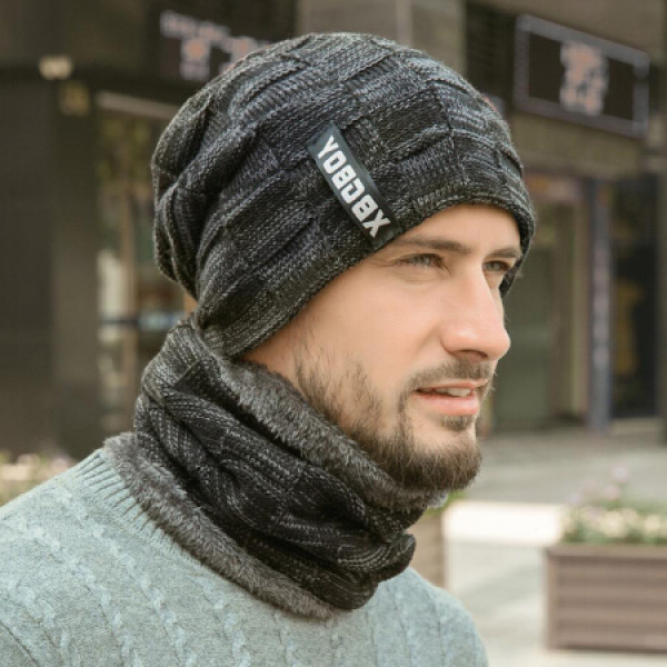 星宇芊 帽子男冬韩版毛线帽子男加绒围脖加厚棉针织帽骑行防风保暖防寒脖套护耳护颈套帽 T05 黑色 礼袋装