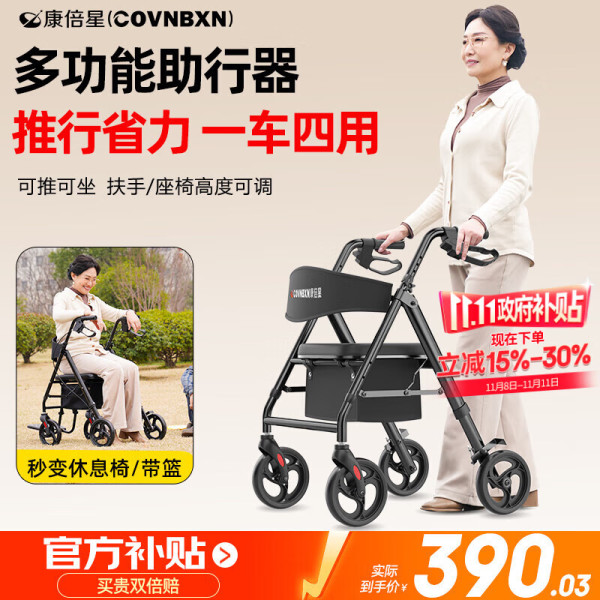 移动端、京东百亿补贴:康倍星 COVNBXN 助行器老年人助力行走器康复锻炼助步车老人手推车防摔倒神器带篮