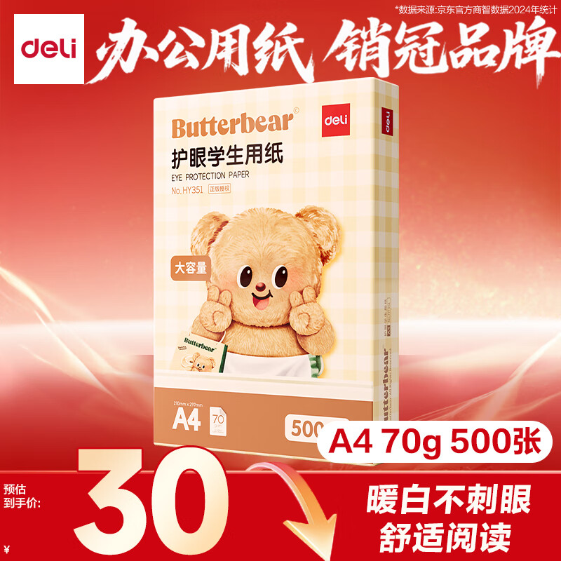 得力(deli)黄油小熊护眼A4打印纸 70g500张单包复印纸 学生作业草稿纸 双面打印作业 HY351【护眼本色】