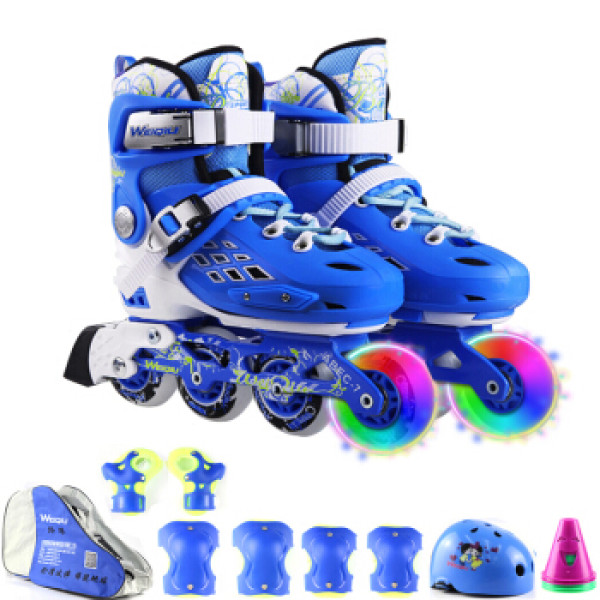 纬球 溜冰鞋儿童轮滑鞋可调节直排旱冰鞋前轮单闪WQ-T1702-B-L蓝色L码