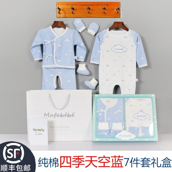 法国mafabebe 秋冬四季新生儿婴儿礼盒初出生宝宝纯棉衣服套装母婴用品满月礼物 四季(薄)款天空清澈蓝7件套 66cm新生礼0-6个月左右的宝宝