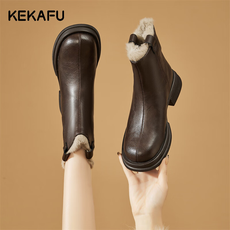 珂卡芙短靴女靴秋冬季2025新款百搭增高显瘦踝靴加绒保暖瘦瘦靴 棕色厚绒跟高4.5cm 35 (225mm)