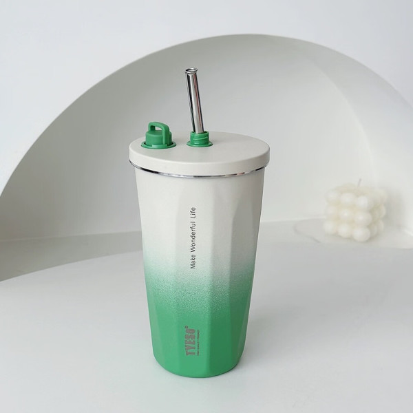 TYESO 泰硕 新款304不锈钢咖啡杯冰霸保温车载吸管杯真空大容量水杯600ml 渐变绿