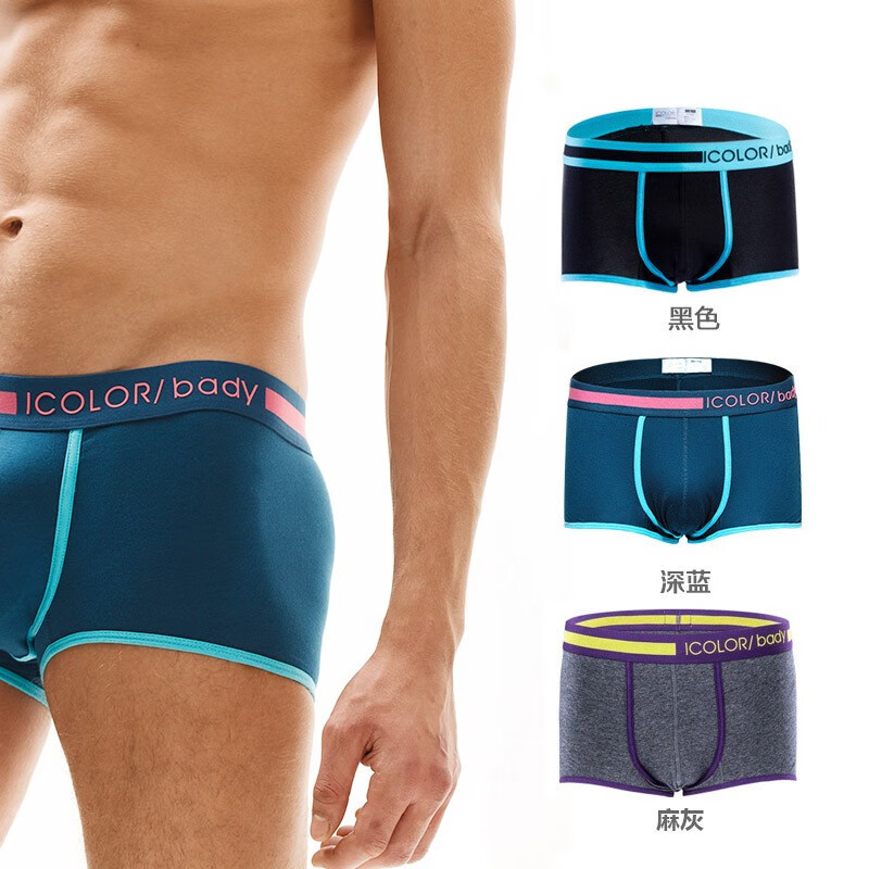 ICOLOR【三条装】青年男士内裤男四角裤纯棉透气个性平角裤舒适大码短裤 【精梳棉】深蓝 黑色 麻灰 M