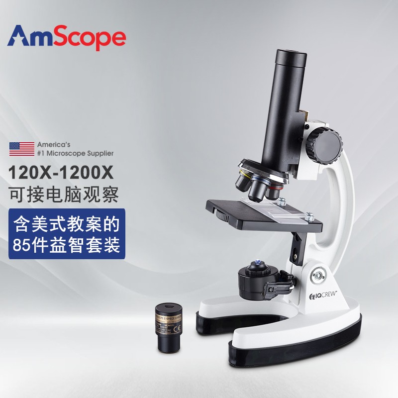 AmScope 1200X初中小学儿童显微镜教学实验便携式益智玩具儿童节生日礼物 M40-K-MDM35-PS25W-BS