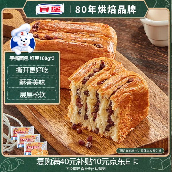 宾堡 手撕面包 红豆 160g/袋*3 480g