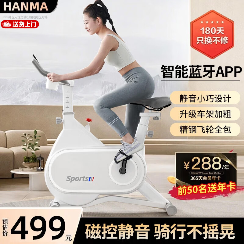 汗马 【销量过万】 家用动感单车静音运动减肥器材健身车室内脚踏车 智能蓝牙游戏APP 物磁双阻 车架加粗【白】