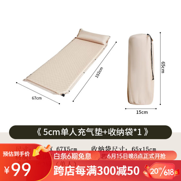 Hewolf户外野营自动充气垫露营双人气垫床家用办公午休睡充气床垫 5cm单人卡其色192*67*5