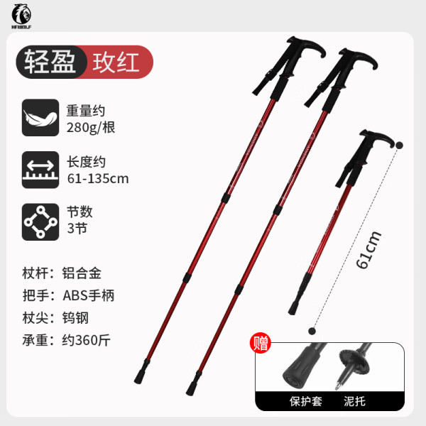 公狼 登山杖 户外徒步超轻伸缩式铝合金爬山棍拐杖便携女装备轻便男 T柄红色-1根