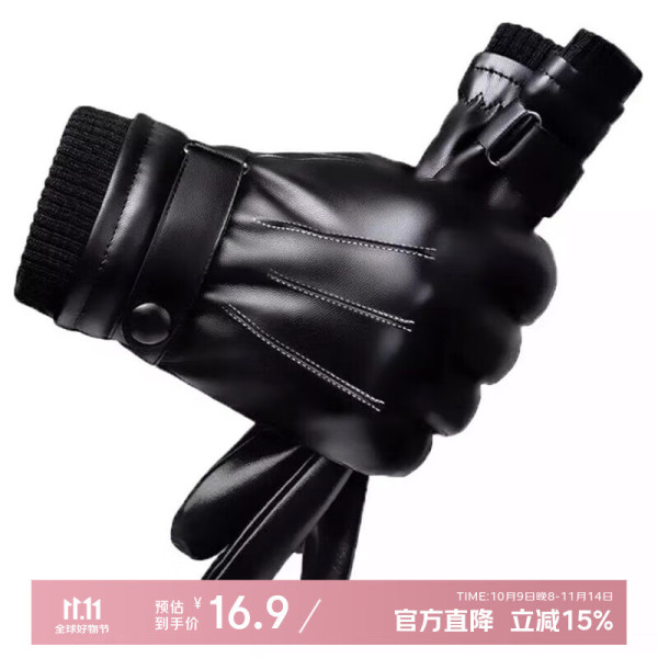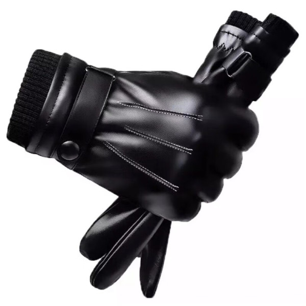 GLO-STORY PU皮手套男触屏手套秋冬季加绒加厚保暖户外骑行手套MST744011 三条杠黑(升级罗口款)