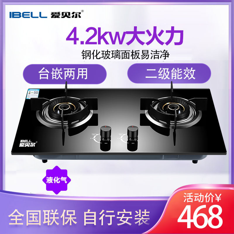爱贝尔(IBELL) JZY-M燃气灶嵌入式大火力 煤气炉双炉灶具 猛火台式家用煤气灶 钢化玻璃易清洁 铜火盖款液化气
