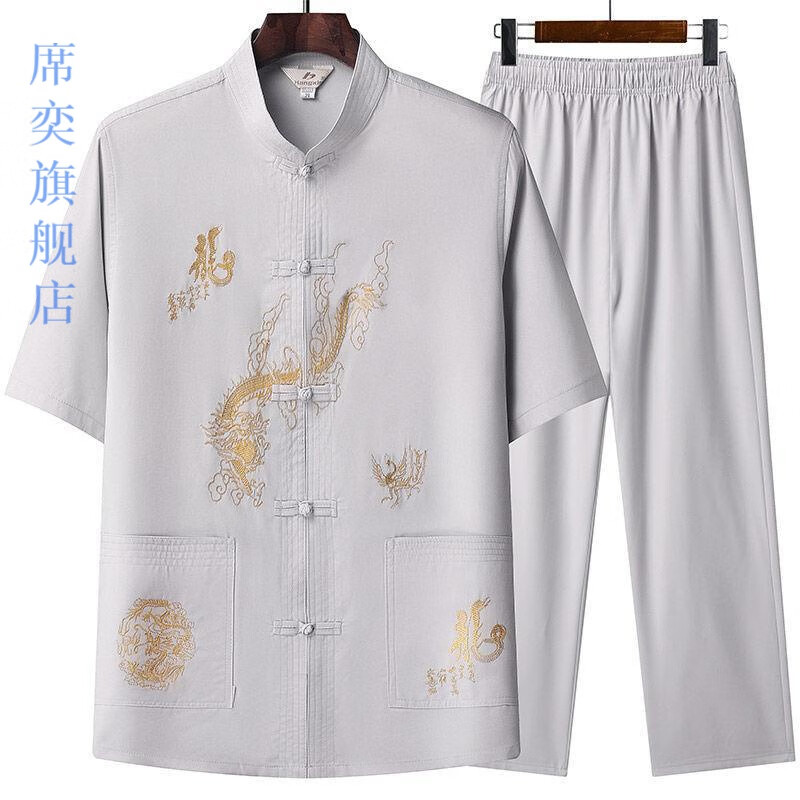 席奕中老年唐装男中国风夏季短袖套装爷爷装太极汉服老人衣服爸爸夏装 灰色套装 39(建议85-115斤)