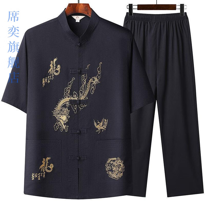 席奕中老年唐装男中国风夏季短袖套装爷爷装太极汉服老人衣服爸爸夏装 藏青套装 43(建议170-190斤)